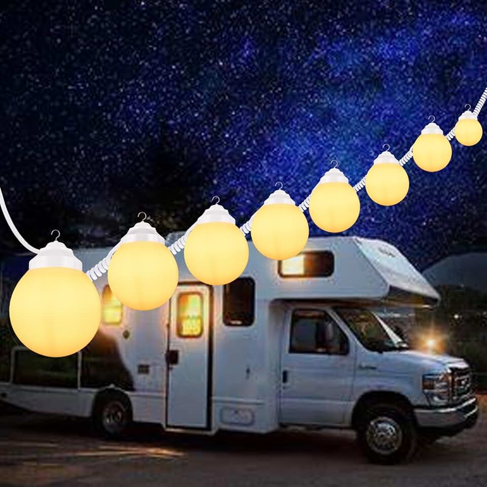 30.5FT RV Globe Awning Lights - White Outdoor Patio String Lights - 8pcs 6in Diameter Acrylic Sunset Awning Lights with 6W A60 Filament LED Glass Bulbs (2700K, Warm White)