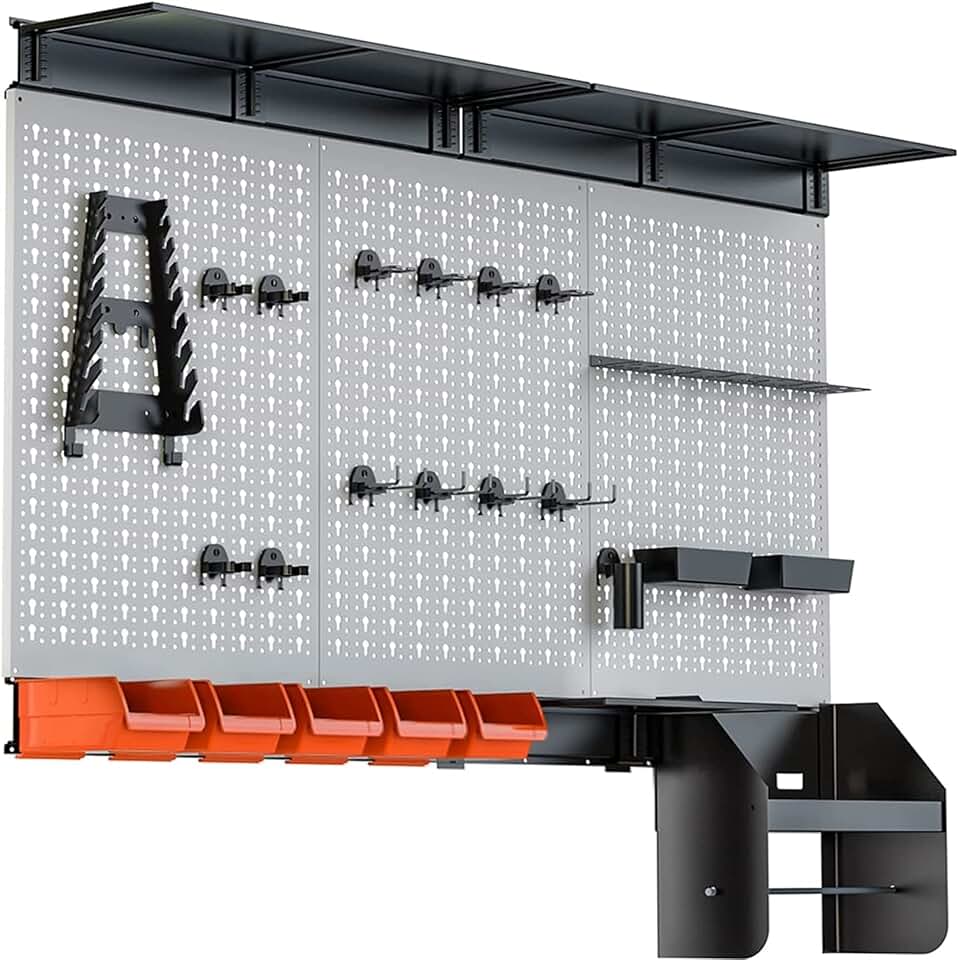 TORACK Pegboard Wall Organizer 4 ft. Garage Metal Utility Tool Storage Kit with Toolboard Hooks Accessories, Wall Mounted Bins, Paper Towel Holder, Overhead Shelf