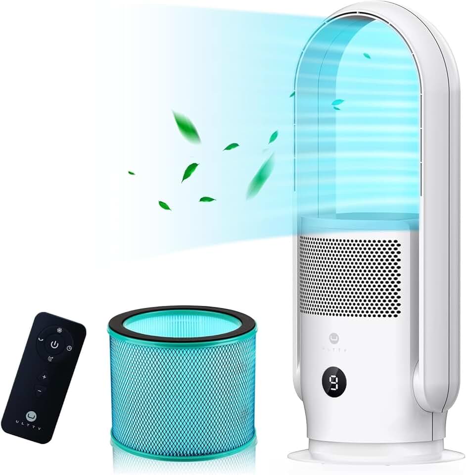 ULTTY Bladeless Tower Fan with Air Purifier, 90° Oscillating Tower Fan with HEPA Filter, Remote Control, Touch, 8H Timer, 9 Speeds, Powerful Floor Fan for Bedroom Room Home Office, CR021, White