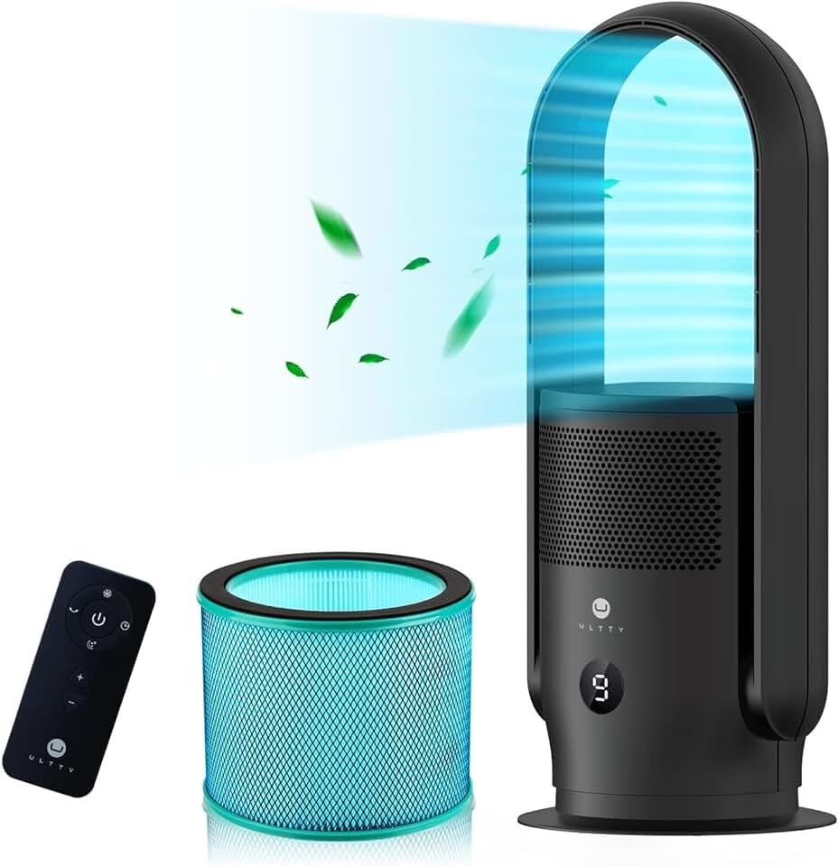 ULTTY Bladeless Tower Fan and Air Purifier in one, 90° Oscillating Bladeless Fan with Remote, Touch, 8H Timer, Floor Fans for Bedroom Whole Room Home Office R021, Black