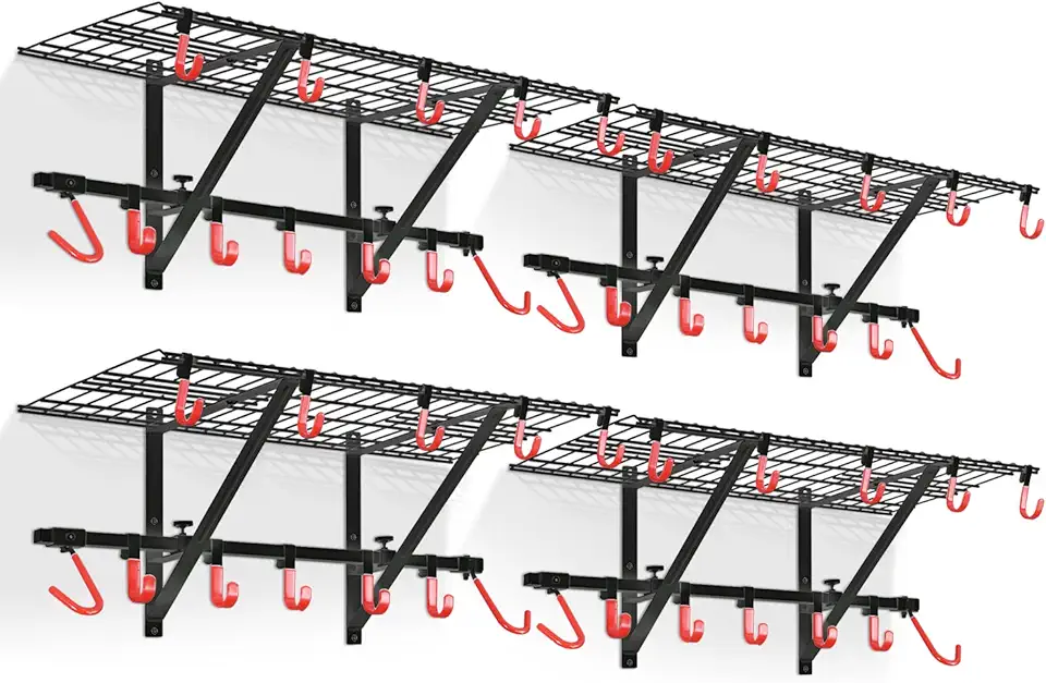 Garage Wall Shelving 4-Pack Includes Bike Hooks, Sturdy Adjustable Garage Shelving Wall Mount Garage Wall Organizer (Black, 4-Pack)