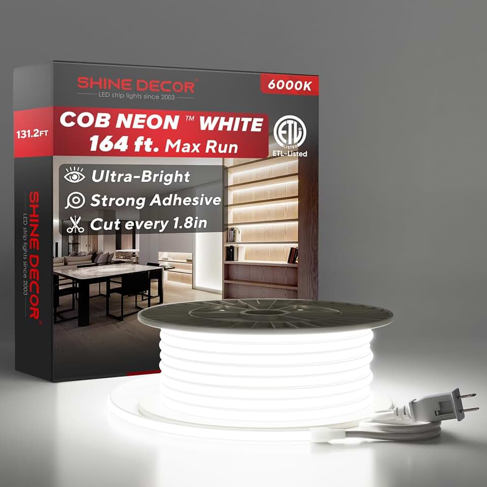 Shine Decor COB LED Neon Rope Light AC110-120V 131.2ft, 800lm Ultra Bright(6000K Cool White), IP65 Waterproof ETL COB LED Strip Light, Cuttable LED Tape Light for Cabinet Bedroom Commercial 10x4.5mm