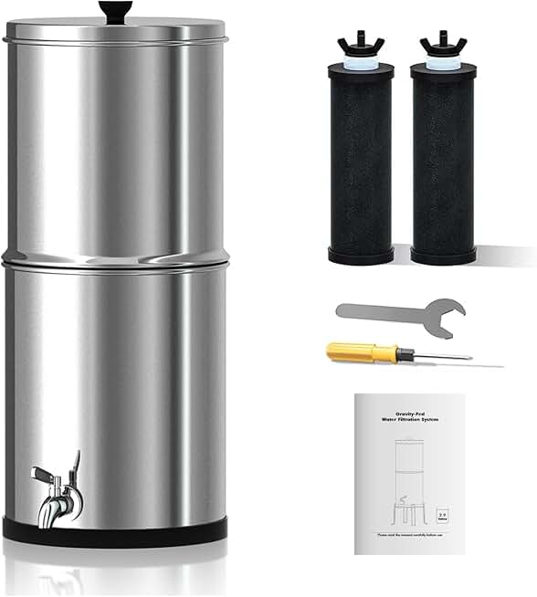 Purewell Stainless Steel Gravity-Fed Water Filter, High Capacity 2.9 Gallon with 2 Purification Elements for Home and Camping Use