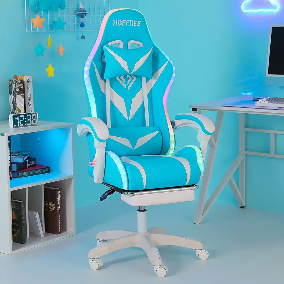 HOFFREE Gaming Chair with Massage and LED Lights Ergonomic Video Game Chairs with Footrest High Back Reclining Computer Chair with Adjustable Lumbar Support Blue and White
