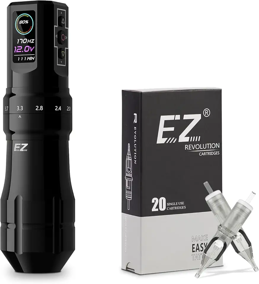 EZ P3 Pro Tattoo Gun Machine - 6 Strokes 2.0, 2.4, 2.8, 3.3, 3.7, 4.2mm Tattoo Machine Pen with 20Pcs #12 (9RL) Standard Round Liner Disposable Tattoo Needles Cartridges (Revolution)
