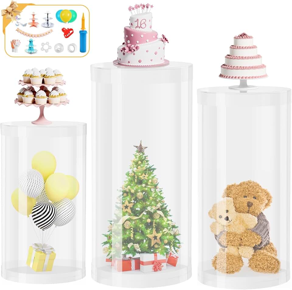Clear Cylinder Pedestal Stand for Party Set of 3 Large Round Cylinder Pedestal Display Plinth Pillars for Wedding Party Dessert Table with 3PCS Cake Stand for Birthday Ceremony Decor