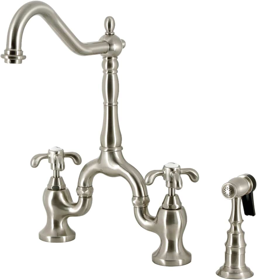 Kingston Brass KS7758TXBS French Country Bridge Kitchen Faucet with Brass Sprayer, Brushed Nickel