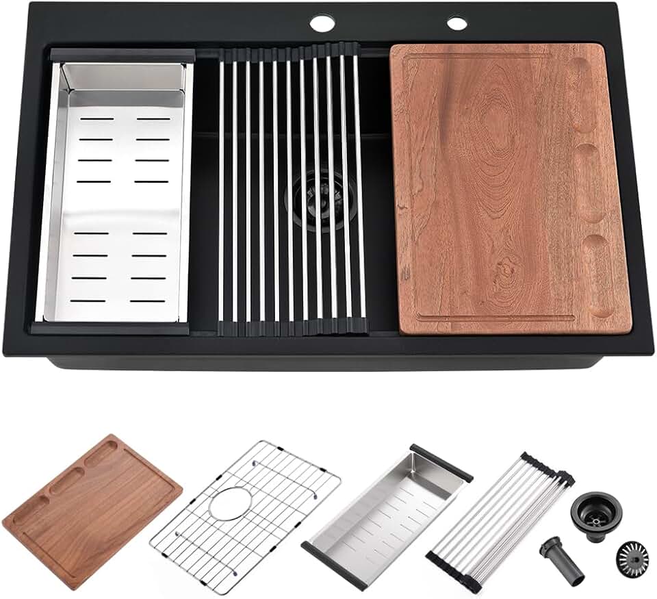 33 Inch Black Drop In Kitchen Sink Workstation-iAnomla 33x22 Kitchen Sink Drop In Topmount Workstation Sink Matte Black Quartz Granite Kitchen Sink Deep Single Bowl Kitchen Sink with Cutting Board