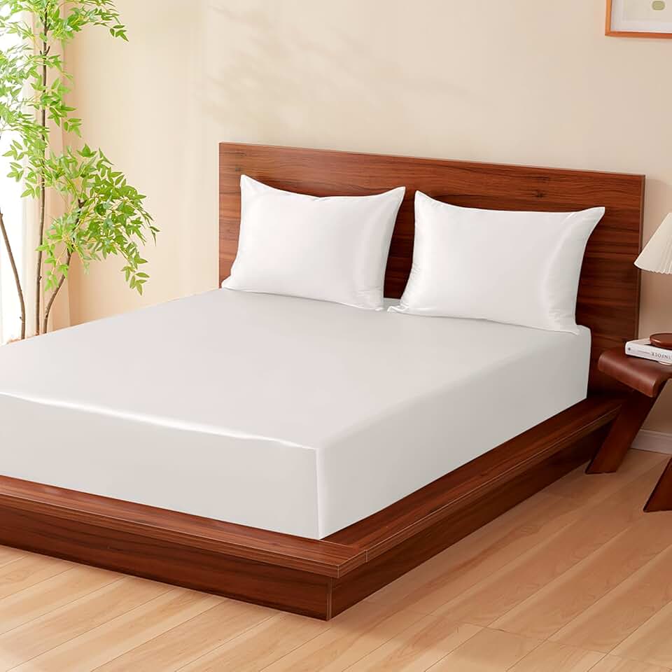 THXSILK 100% Mulberry Silk Bed Sheet Set - 3pcs Pure Silk Sheet Set - 16" Deep Pocket Fitted Sheet, 2 Pack Silk Pillowcase with Zipper Closure - Queen Size, Pearl White