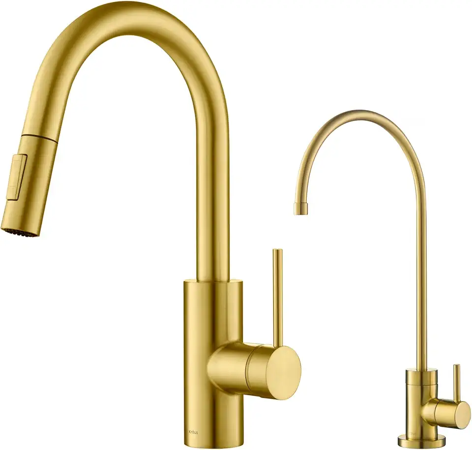 KRAUS Oletto Pull-Down Kitchen Faucet and Purita Water Filter Faucet Combo in Brushed Brass, KPF-2620-FF-100BB