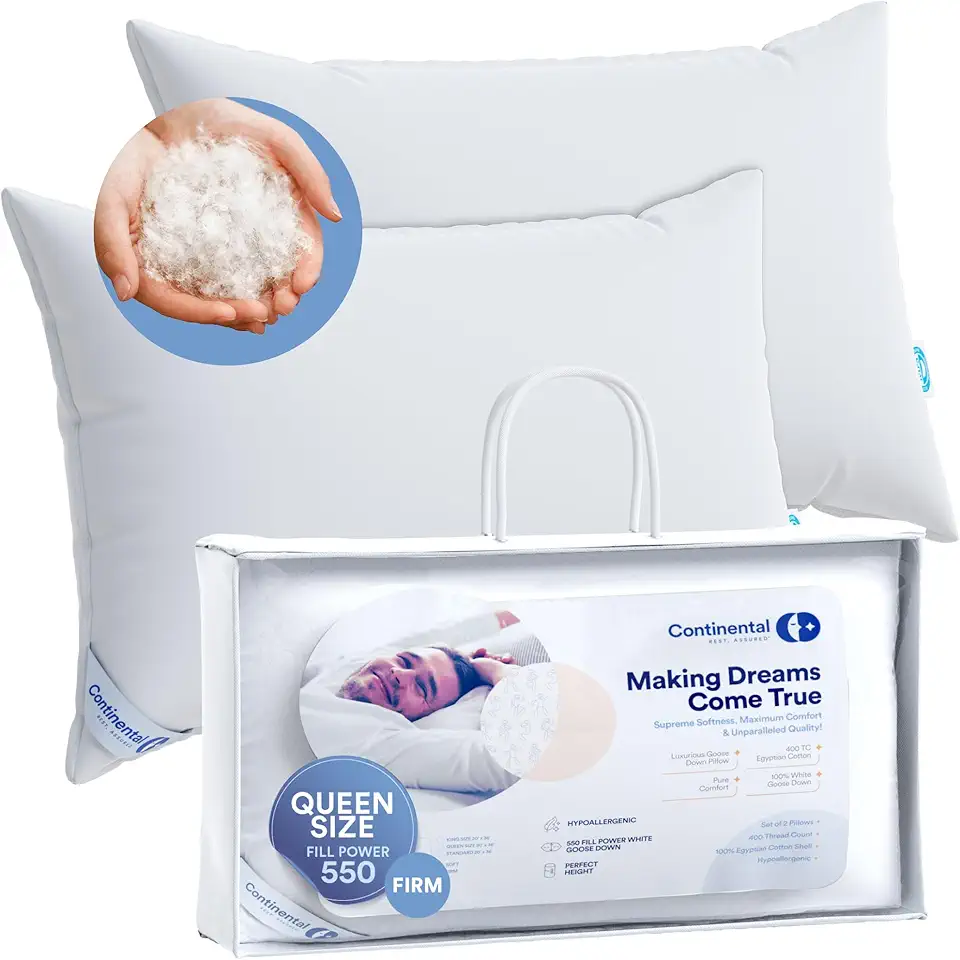 Continental Bedding Luxury Down Pillows Queen Size Set of 2 - Family Made in New York - Breathable Bed Pillows for Sleeping on Side Sleepers - 550FP Firm, Moderate Firmness and Loft