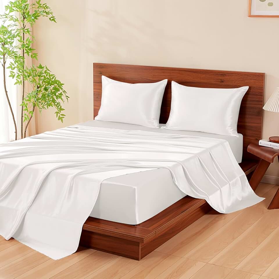 THXSILK 100% Mulberry Silk Bed Sheets Set - 4pcs Pure Silk Sheets Set - Flat Sheet, 16" Deep Pocket Fitted Sheet, 2 Pack Silk Pillowcase with Zipper Closure - King Size, Pearl White