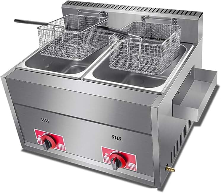 Commercial Deep With Seasoning Trough And 2 Stainless Steel Frying Baskets, Thick Stainless Steel Counter Top, Fryer Double-cylinder Gas Deep