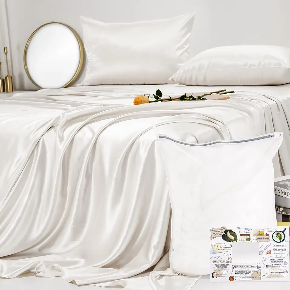 PROMEED 23 Momme 100% Silk Sheet Set White with Flat Sheet, Deep Pocket Fitted Sheet and Pillowcases, Ultra Soft Grade 6A+ Natural Silk Bedding Sheets Set 4 Pieces (White, King)