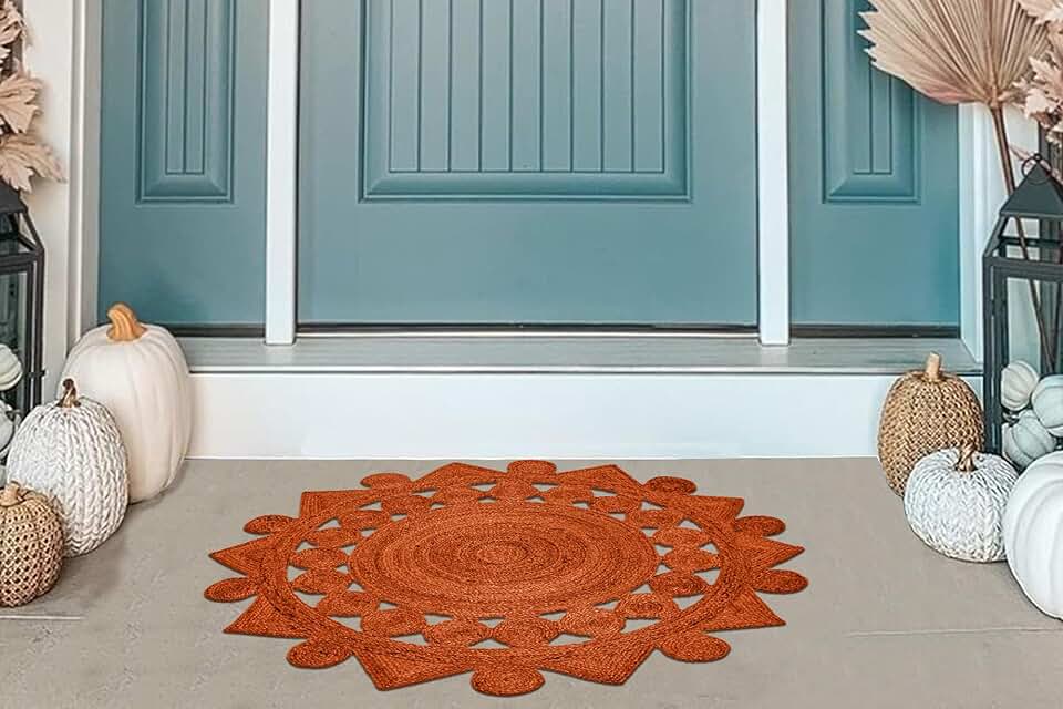 10' Round Rug Kilim Rug Orange Pattern Braided Jute Rug Indoor Outdoor Rug Flatweave Rug High Traffic Area Dining Table Round Hall Room Round Patio Rug