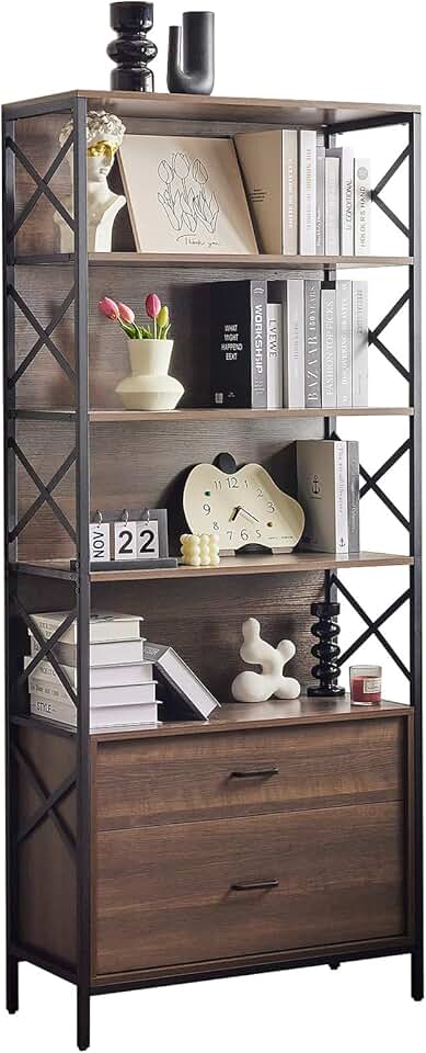 Redlife 5-Tier Bookshelf w/File Cabinet Drawers Industrial Wood Bookcase Standing Storage Organizer for Living Room Home Office