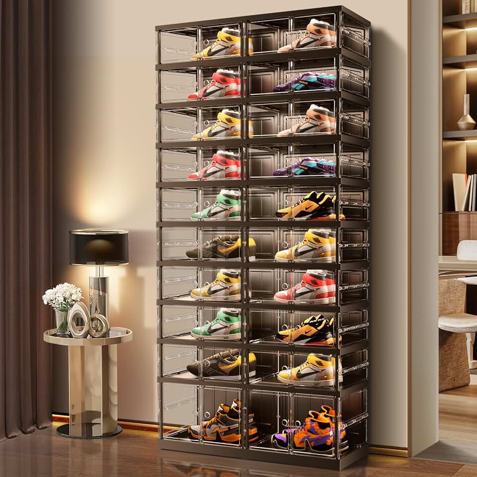 10 Tiers 20-40 Pairs Foldable Shoe Boxes Large Plastic Shoe Storage Rack Collapsible Shoe Organizer for Closet Clear Stackable Shoes Shelf Storage Cabinet with Doors Quick Assembly Black
