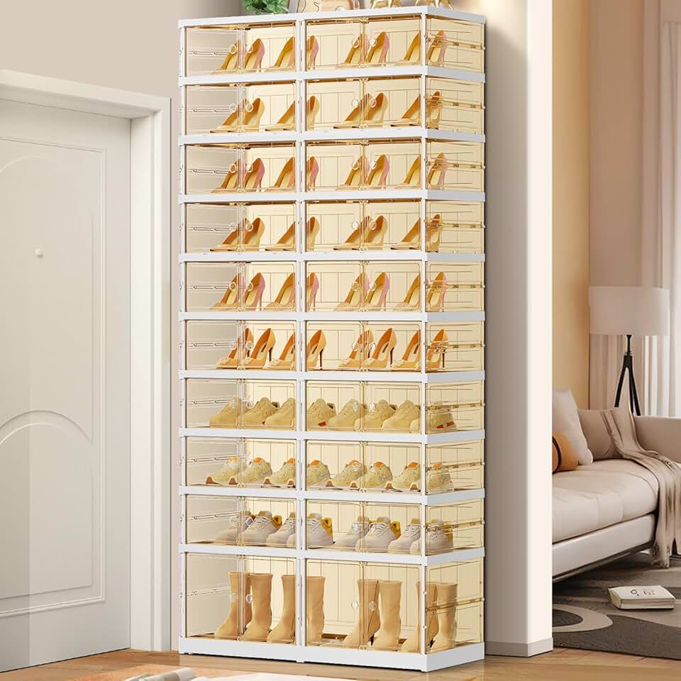 10 Tiers 20-40 Pairs Foldable Shoe Boxes Large Plastic Shoe Storage Rack Collapsible Shoe Organizer For Closet Tall Shoe Shelf Clear Stackable Shoes Cabinet with Doors Entryway