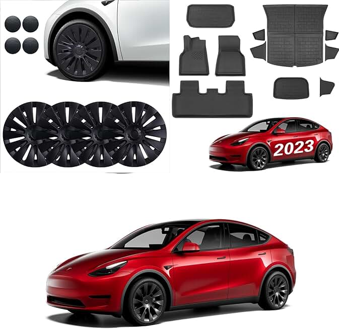 BASENOR 4PCS Tesla Model Y Hubcaps 19 Inch and 11PCS Tesla Model Y Floor Mats