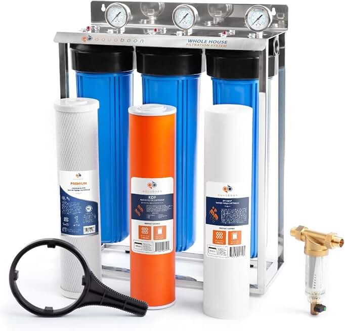 Aquaboon 3-Stage Whole House Water Filter System with Prefilter & 20x4.5 Water Filters | Gauge & Release, Wrench, Freestanding Steel Frame Included