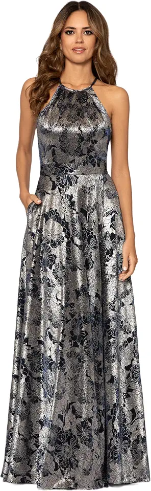 Betsy & Adam Women's Long Sleeveless Halter Metallic Print Wrap Overlay Gown