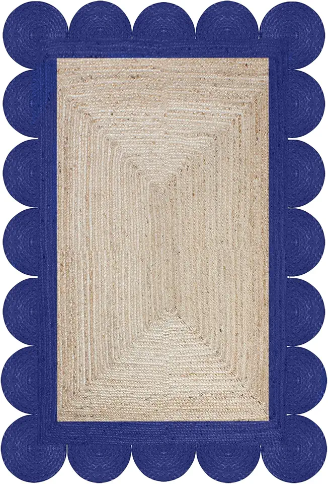12' Square Rug Kilim Rug Scalloped Rug Beige & Navy Blue Braided Jute Rug Indoor Outdoor Rug Flatweave Rug High Traffic Area Bedroom Bedside Custom Mat Dining Table Doormat