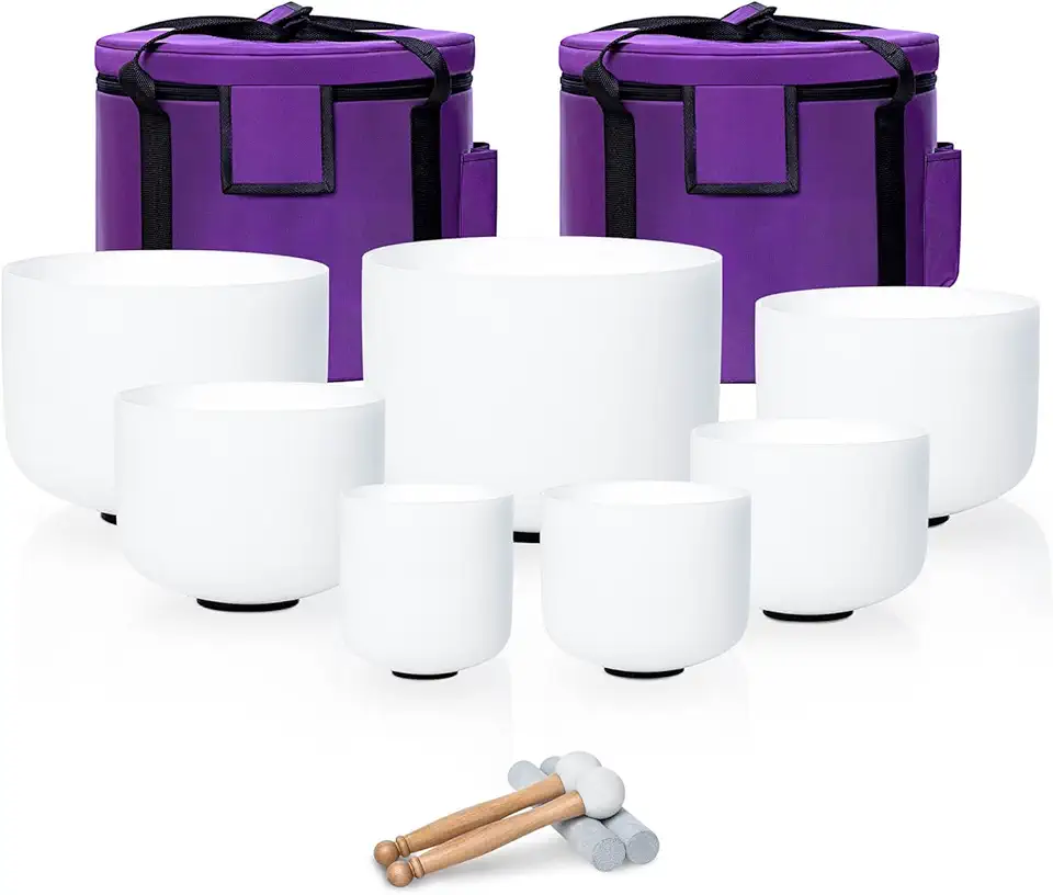 6-12inch White 432hz Quartz Crystal Singing Bowls Set of 7, for Healing Mindfulness Meditation Yoga Sound Baths with Case Mallet Suede Striker