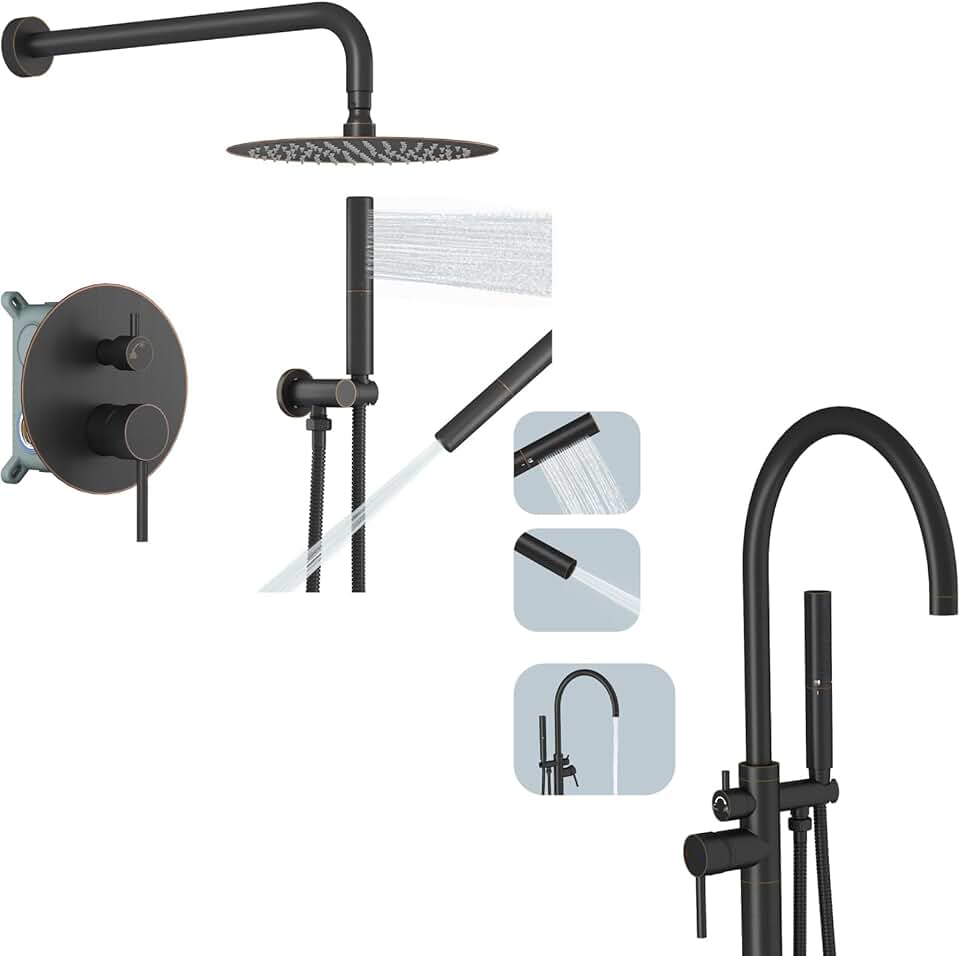 BESy Shower System with 10 Inch Round Rain Shower Head and Handheld Wall Mounted And Freestanding Bathtub Faucet Tub Filler Floor Mount Stand Brass Bathroom Tub Faucets