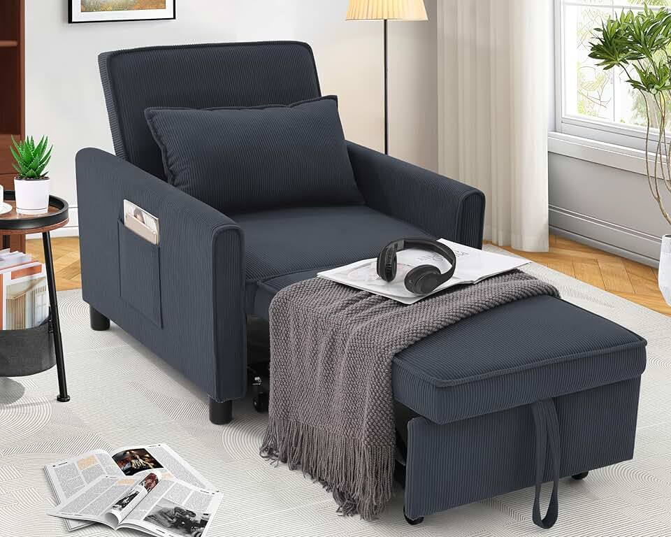 SEJOV Sleeper Chair, 4-in-1 Convertible Sleeper Sofa Bed with Adjustable Backrest, Corduroy Pull Out Chair Bed Single Recliner for Living Room, Bedroom, Apartment, Office, Small Space, Grey Black