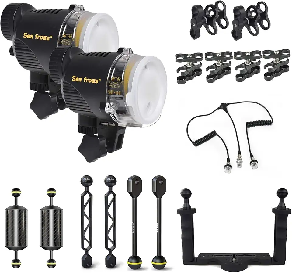 Seafrogs SF-01 Underwater Lighting Strobe Kit. Includes 2X Strobes, 2X Float Balls, 4X Extension Bars, 1xOptical Fiber Cable, 1x Aluminium Tray for SeaFrogs housing with Fiber Optic Port