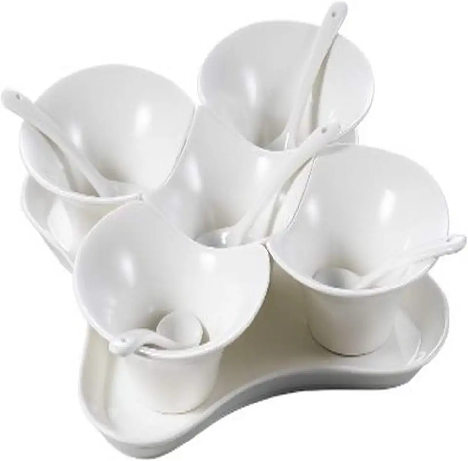CAC China PTB-11SET Porcelain Condiment Plate Set with 5 Bowls/5 Spoons and Tray, 8-3/4-Inch, Super White, Box of 12