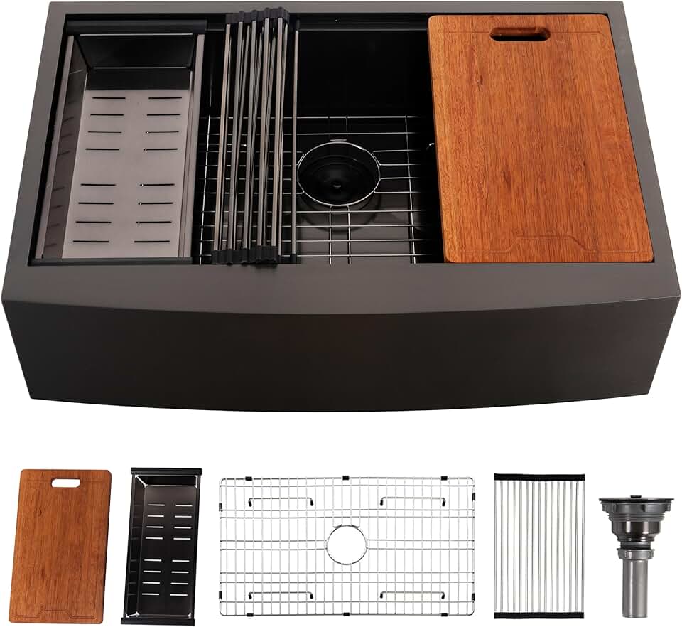 VCCUCINE 33 Inch Gunmetal Black Farmhouse Sink,33X22 Inch Single Bowl Farmhouse Kitchen Sink,16 Gauge Stainless Steel Apron Front Farm Sink,Undermount Workstation Farmer Sink With Accessories
