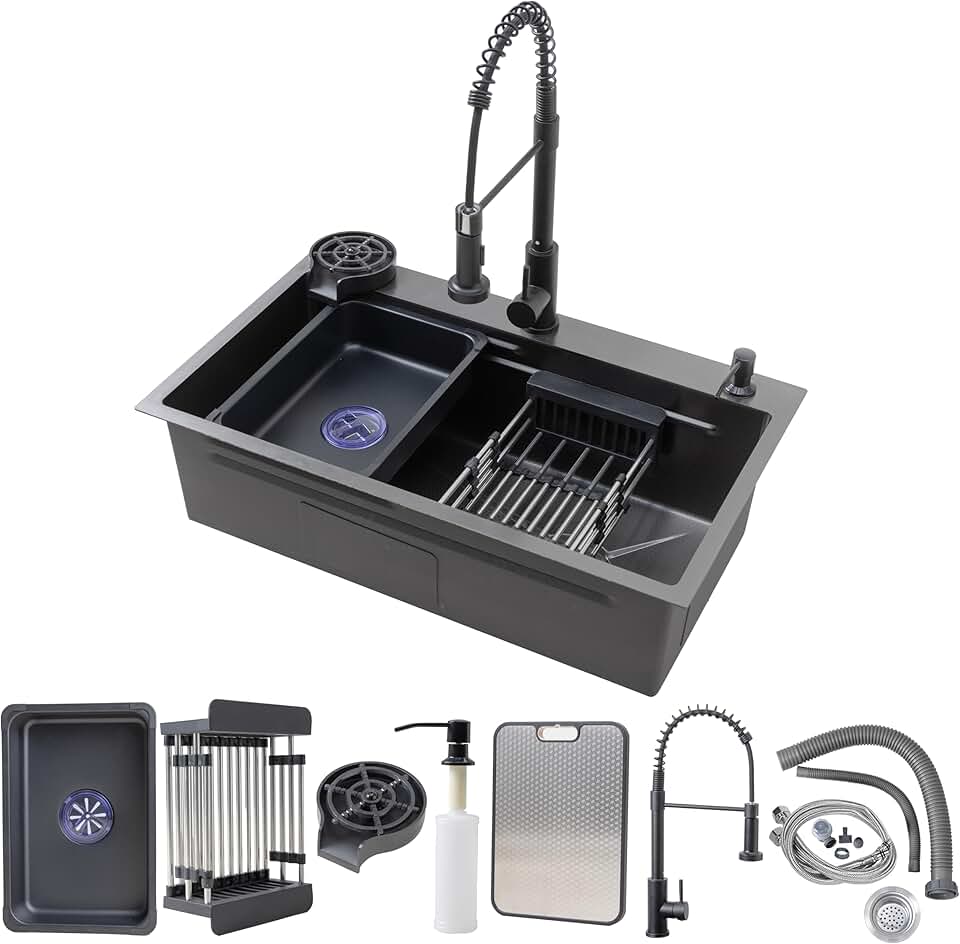 29.5 x 17.7 inch Black Kitchen Sink, Single Bowl Stainless Steel Sink, Multifunctional Drop In Sink Workstation, with Spring Pull-Down Faucet and Cup Washer, Soap Dispenser