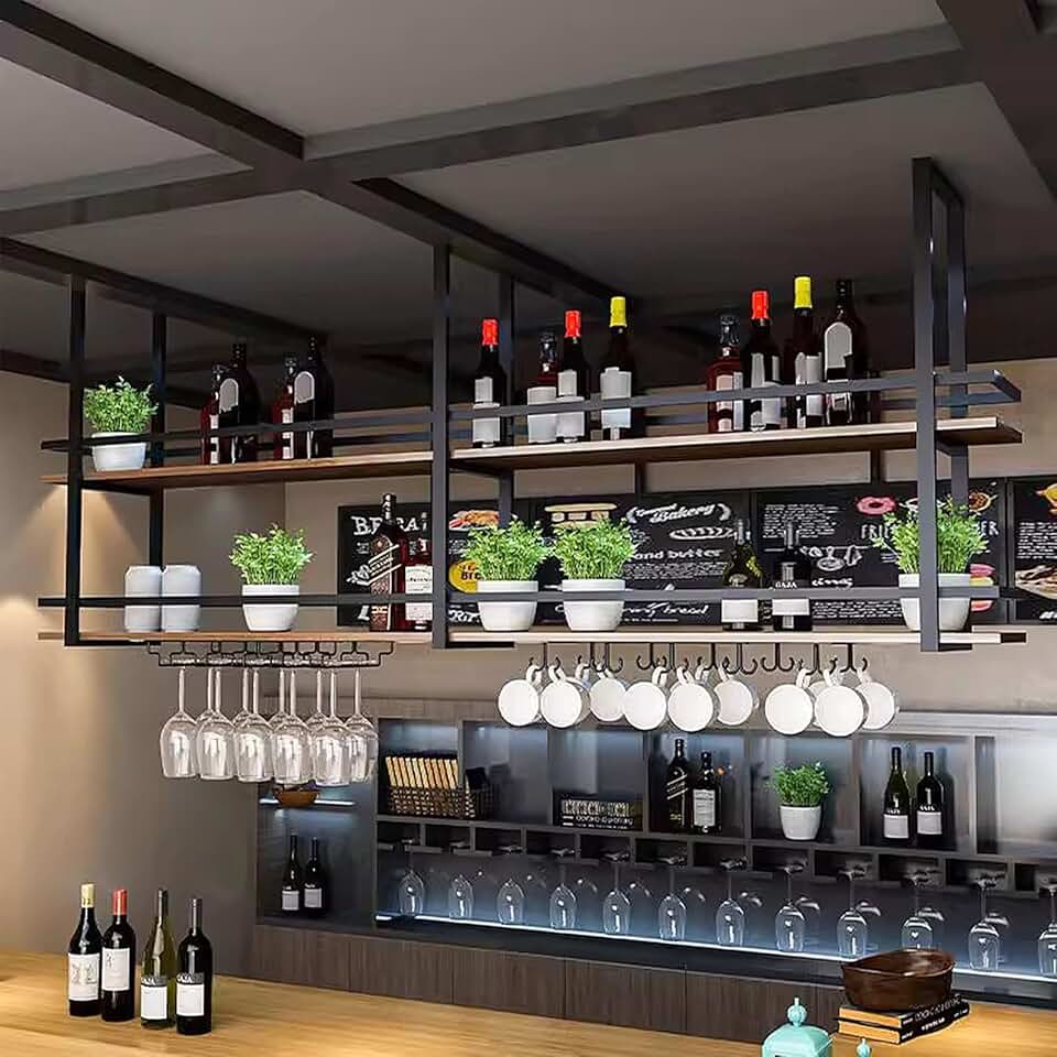Hanging Wine Rack, Metal Ceiling Wine Glass Rack, 2 Layer Industrial Wine Bottle Holder with Glass Holder and Shelf, Modern Display Wine Rack cabinets, for Bar Cafe Cellar Restaura