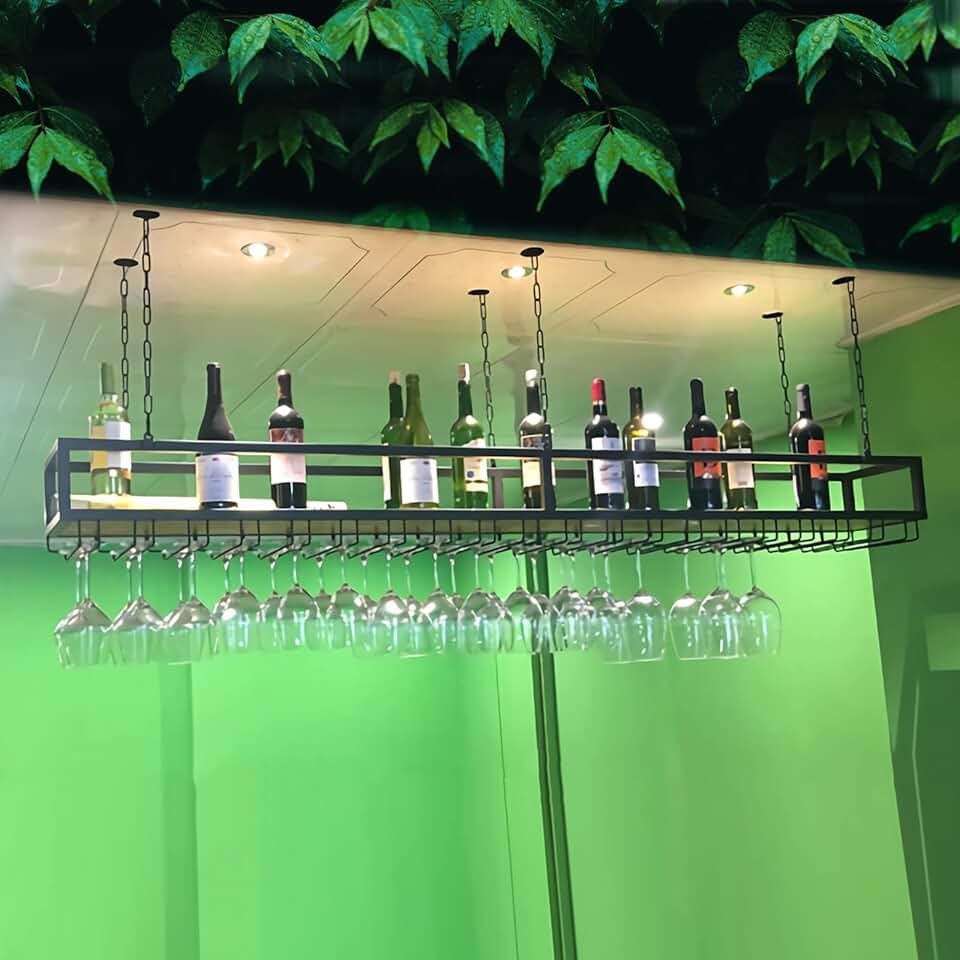 Hanging Wine Rack with Glass Holder Shelf, Ceiling Mounted Wine Rack Adjustable Industrial Hanging Wine Bottle Holder, Metal Iron Wine Shelf Perfect for Bar Cafe Kitchen