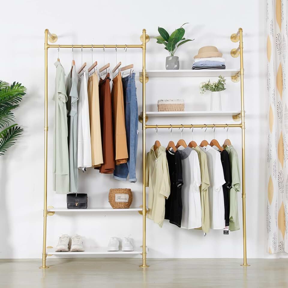 Gold Clothing Rack Heavy Duty Garment Rack with 4 Tier Shelves, Free-Standing Industrial Pipe Clothes Rack Display Rack On Wall for Hanging Clothes Retail Display, Boutiques