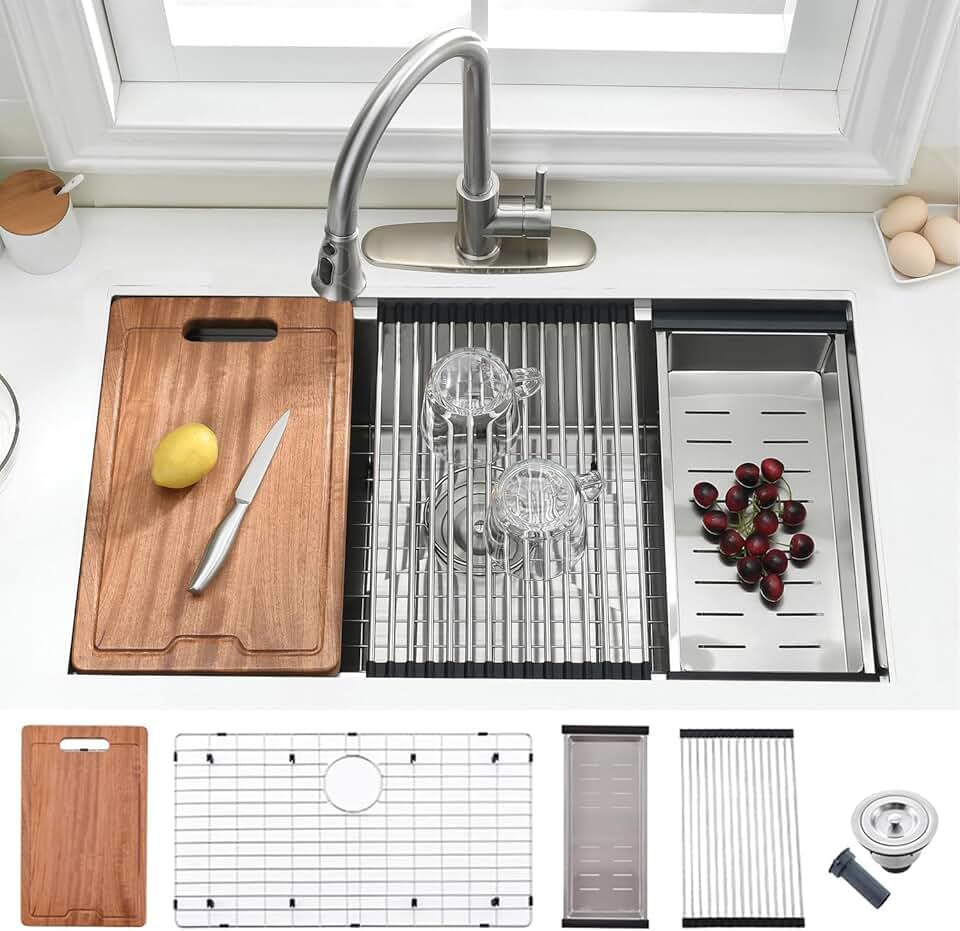 33Inch Undermount Workstation Kitchen Sink Stainless Steel -VOKIM 33 Inch Undermount Kitchen Sink Single Bowl 16 Gauge Stainless Steel Handmade R10 Deep Undermount Sink Basin with Accessories