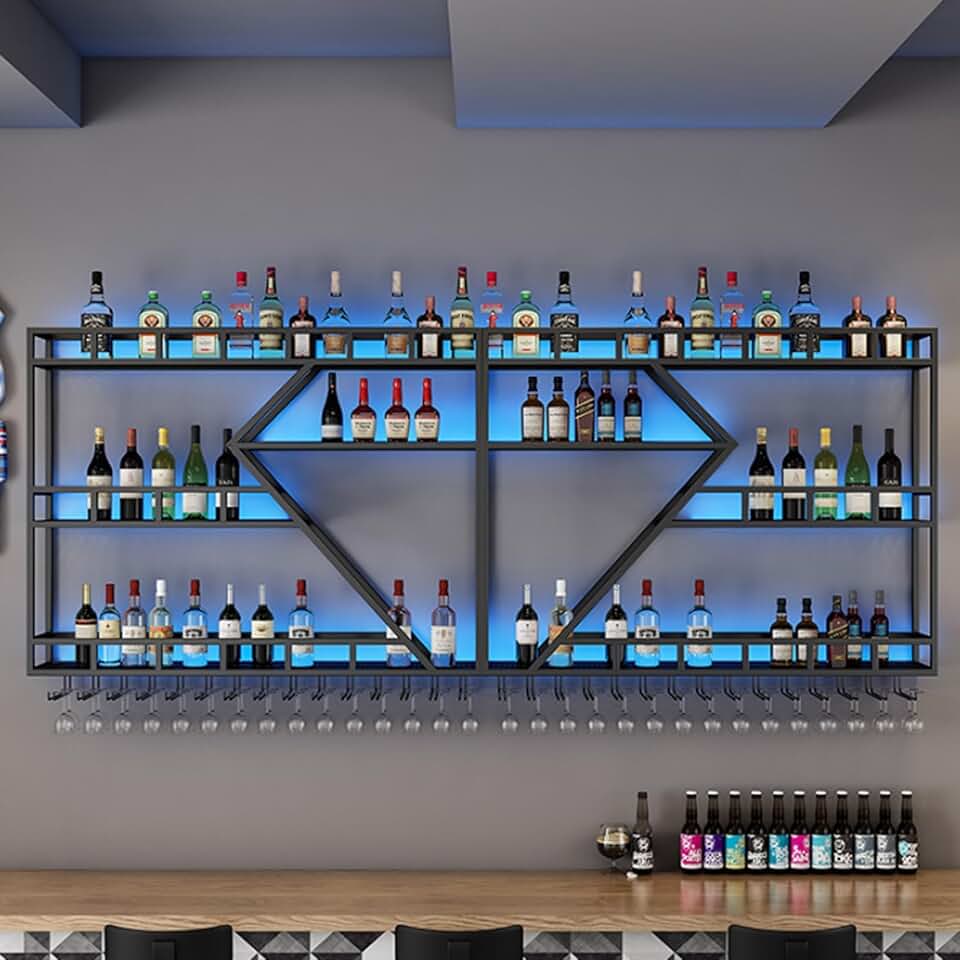 Wall Mounted metal wall Large shelf With LED Light,Modern Industrial bar shelves for liquor bottles,Floating liquor bottle decorations display shelf,3-Tier Large Capacity,For home, bar, restaurant(Bla