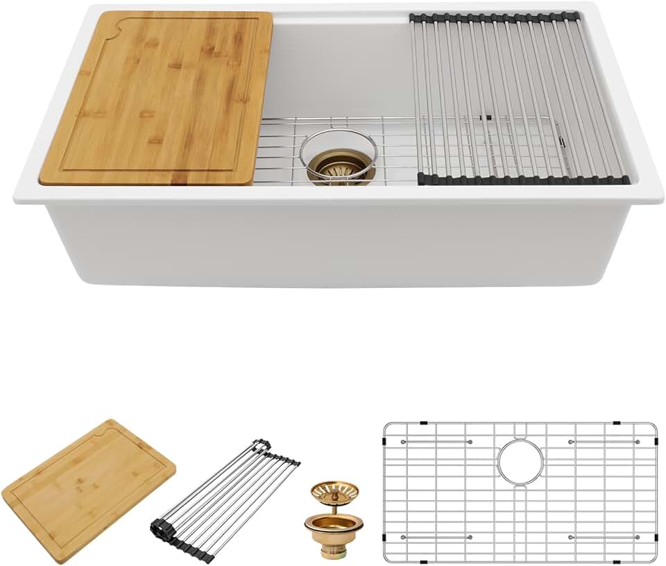MILOSEN White Undermount Kitchen Sink, 33x18 Inch Workstation Ledge Under Counter Single Bowl Sinks, Granite Composite Quartz Sink, Large Deep Basin With Gold Accessories