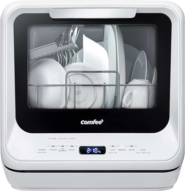 COMFEE' Portable Dishwasher Countertop with 5L Built-in Water Tank, No Hookup Needed, 6 Programs, 360° Dual Spray, 192℉ High-Temp& Air-Dry Function, Mini Dishwasher for RVs, White