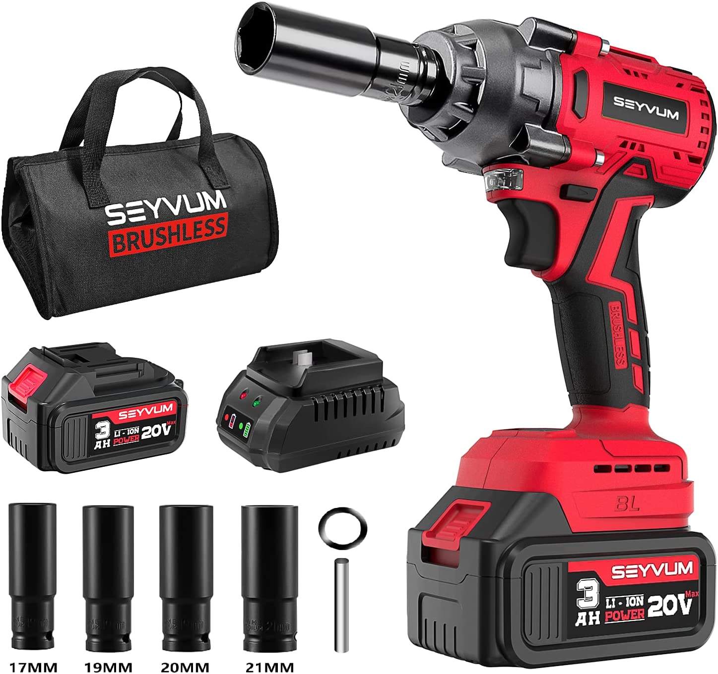 SEYVUM Impact Wrench, 1/2" Impact Gun, Power Impact Driver Max Torque 320 Ft-lbs (430N.m), Cordless Impact Wrench with 20V Brushless Motor, 3.0Ah Li-ion Battery with Fast Charger, 4 Pcs Impact Sockets