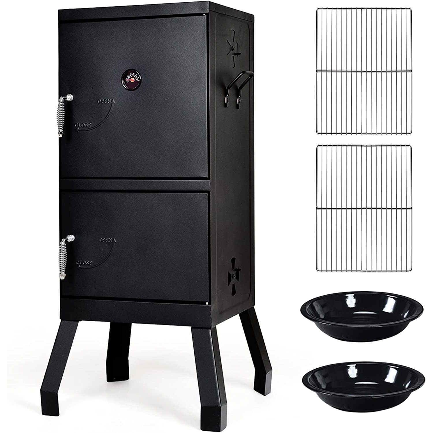 GxIne Outdoor Smoker with Double Doors, 2 Detachable Grill Netting pp Racks, Charcoal Pan & Water Pan, 4 Air Vents, Thermometer, Vertical Charcoal Smoker for Barbecue Camping Backyard Grill