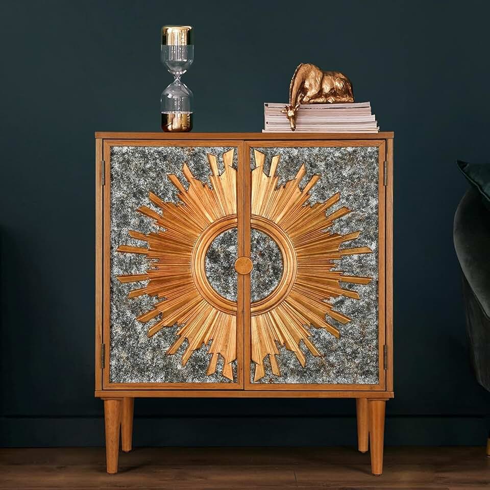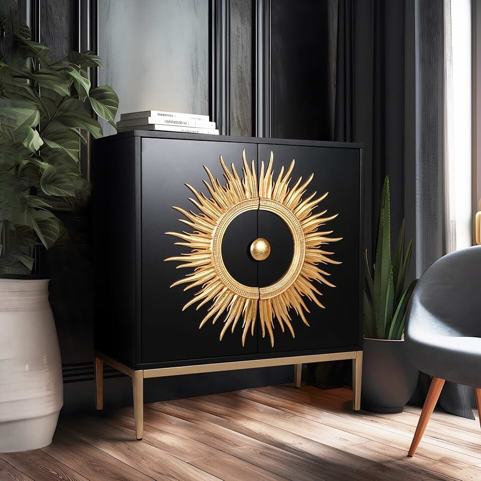 High-End Accent Cabinet with Gold Sunburst Design, Modern Sideboard Buffet with Storage and Doors, Mid-Century Modern Solid Wood Cabinet for Living Room, Kitchen or Office