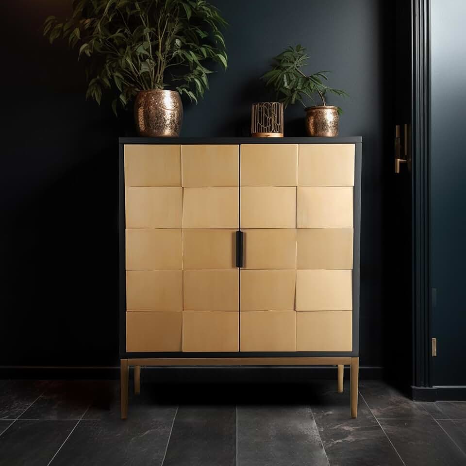 Modern Gold Accent Cabinet with Textured Geometric Design, 2-Door Storage Single Credenza, Stylish Sideboard Buffet for Living Room, Office or Entryway, Black Frame, and Sleek Gold Metal Legs