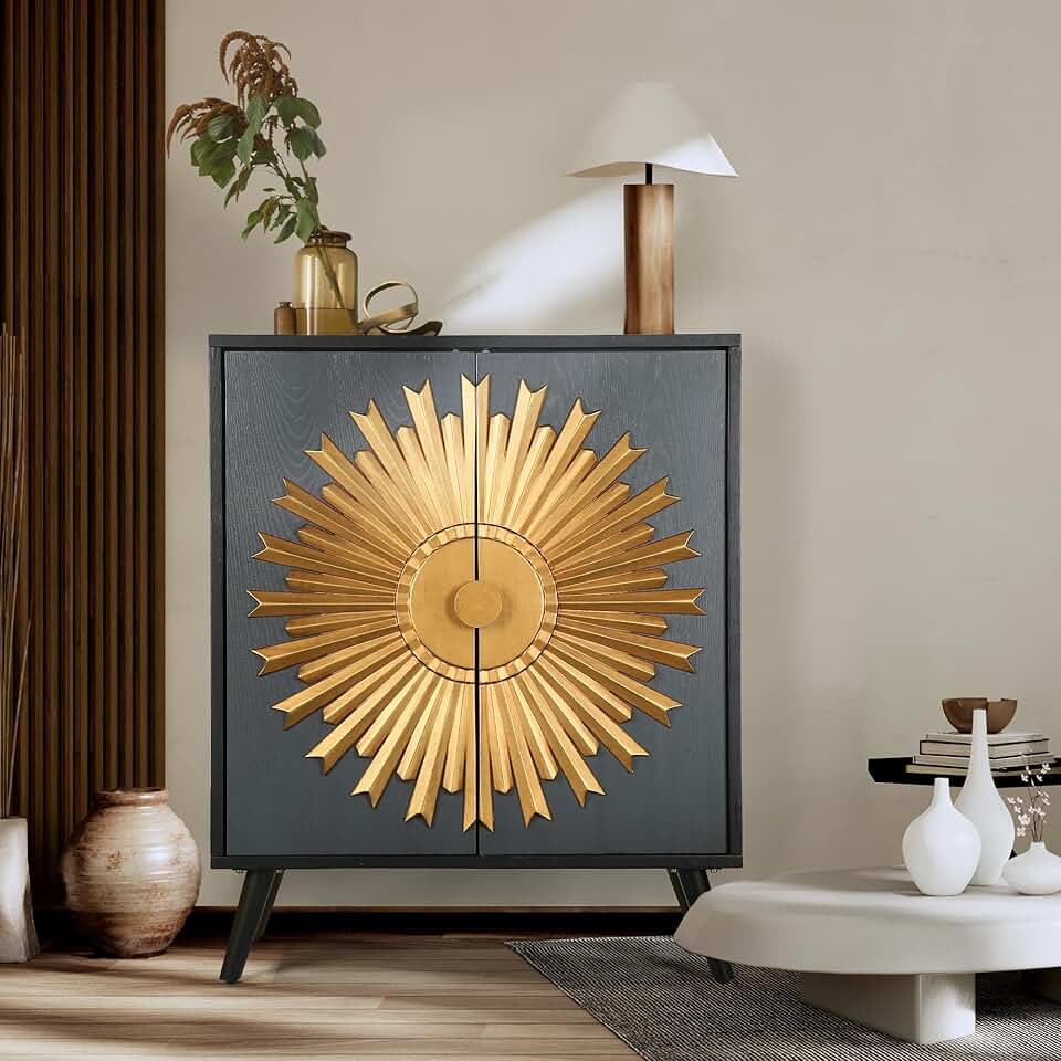 Black, Grey and Gold Accent Cabinet with Sunburst Design, Mid-Century Modern Sideboard Buffet with Storage and 2 Doors, Stylish Single Credenza for Living Room, Bedroom, Office or Entryway