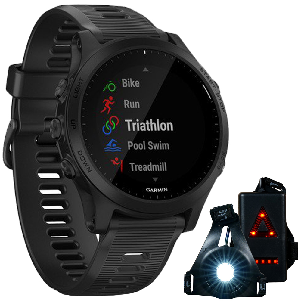 Garmin 010-02063-00 Forerunner 945 GPS Sport Watch (Black) Bundle with Deco Essentials Wearable Commuter Front and Rear Safety Light, Adjustable Comfort Strap