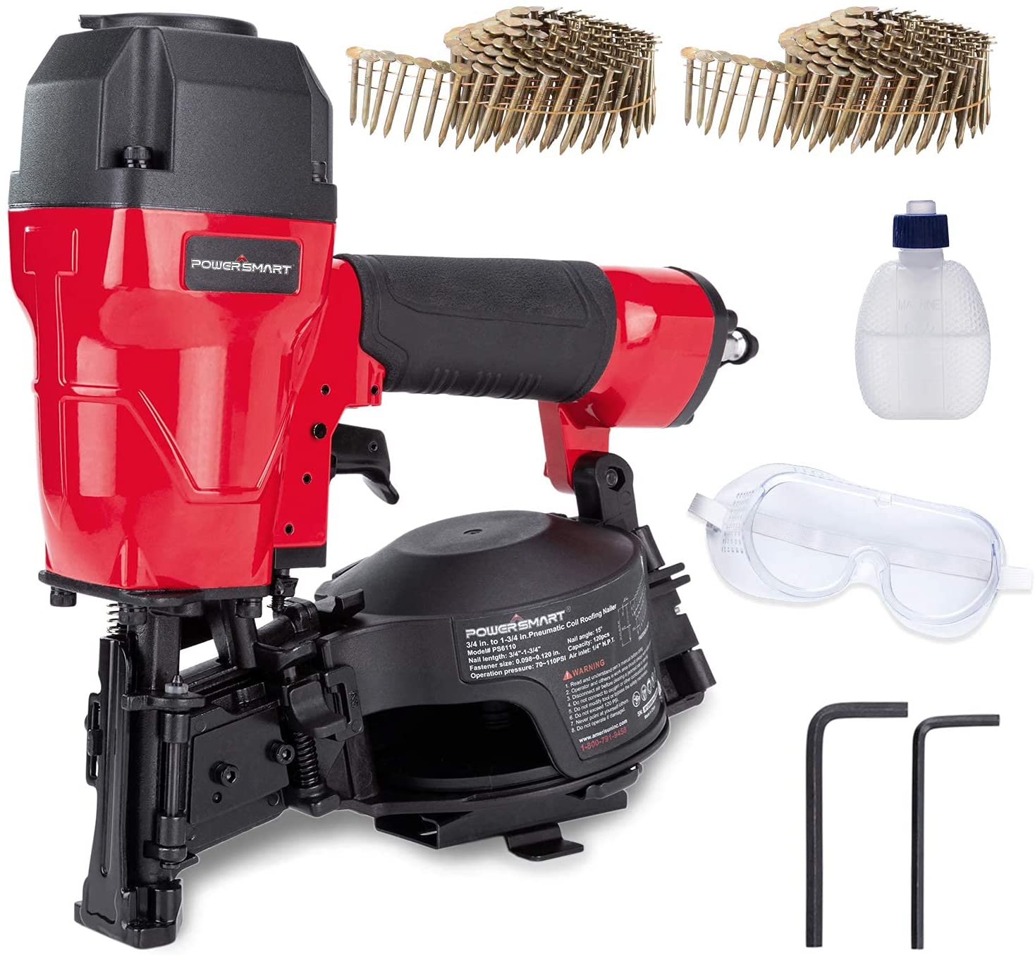 PowerSmart 15 Degree Pneumatic Coil Roofing Nailer, 120 Pcs Load Capacity Coil Nailer with 240 Pcs Nails, PS6110-3P1