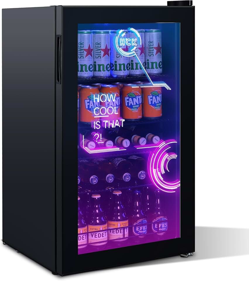 HCK Beverage Refrigerator, Mini Gaming Fridge with Glass Door, Black Cyberpunk Beer Fridge LED Lighting Bar Fridge for Gaming Room 3.5 Cu.Ft.126 Can