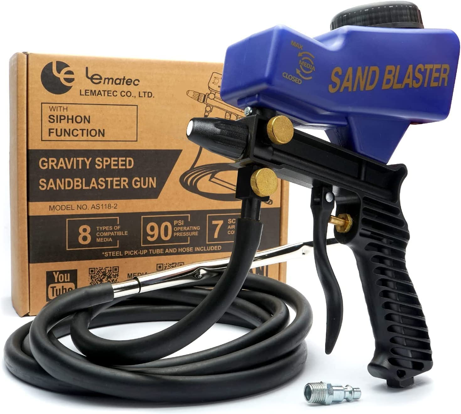 Le Lematec Premium Gravity Speed Sand Blaster Portable Gun Kit With Siphon Function (AS118-2) 10 Ft. Hose, Pneumatic Tool Rust Remover, Paint Stripper, Continuous Blasting for Metal.
