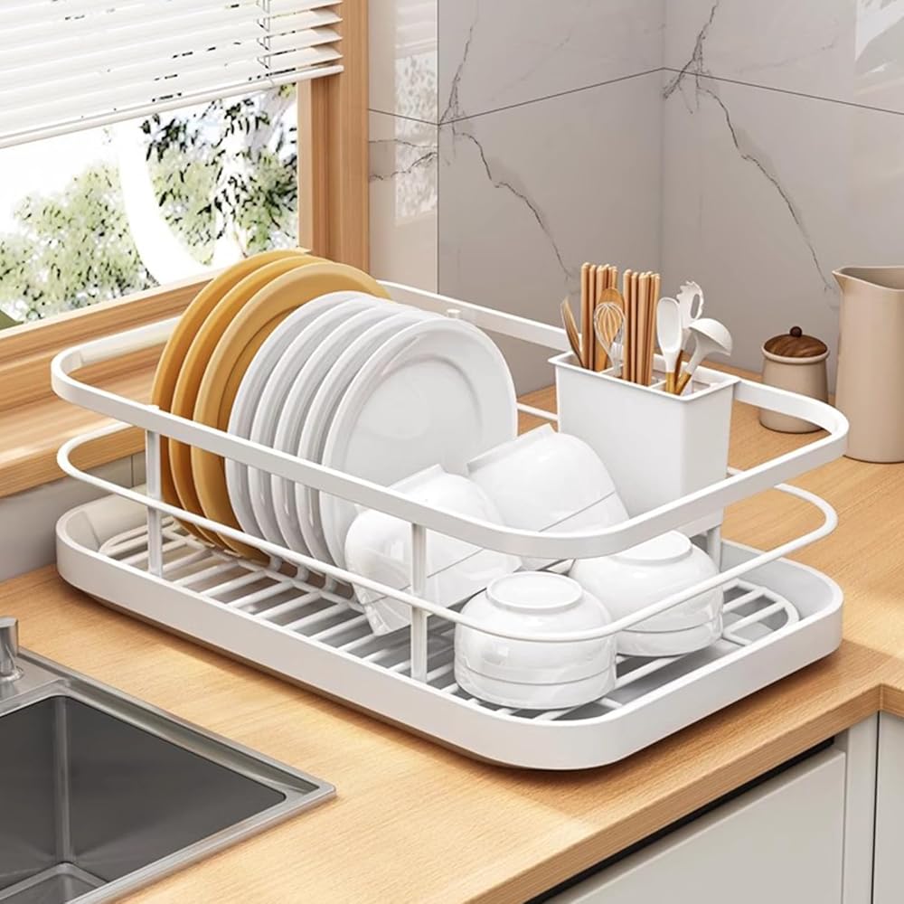 Kitchen Counter Dish Drying Rack,Stainless Steel Dishes Drainer with Cup Holder Utensil Holder,Space-Saving Dish Rack,Removable Plastic Drainer Tray,B,White